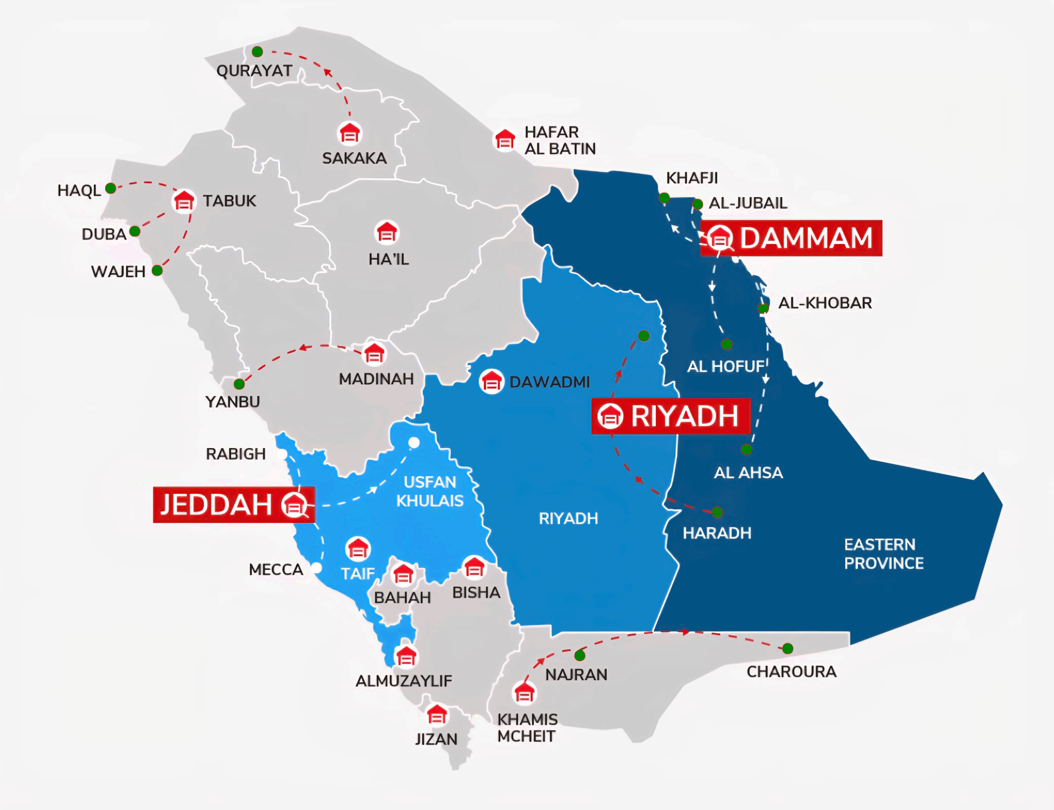 We cover over +1000 points of sales across various regions in the Kingdom: